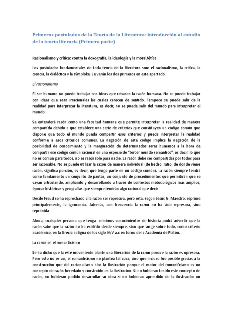 Los postulados fundamentales de toda teoría de la literatura son: el racionalismo, la crítica, la