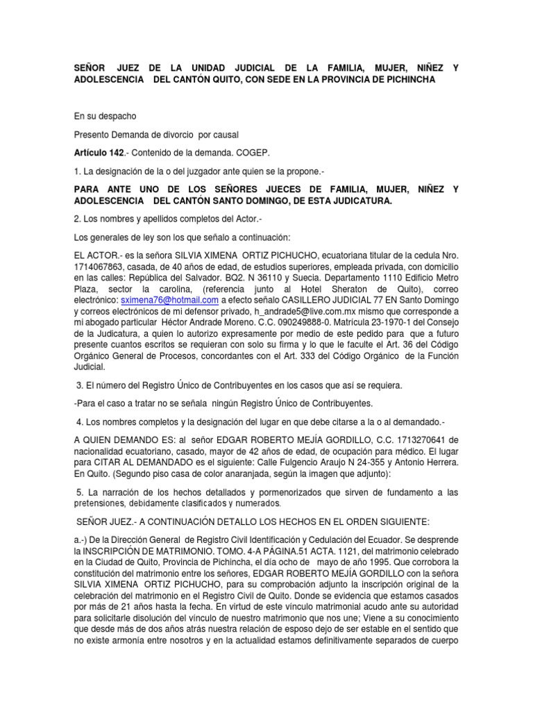 XIMENA ORTIZ PICHUCHO en tal virtud pido SE ADMITA LA DEMANDA DE DIVORCIO POR