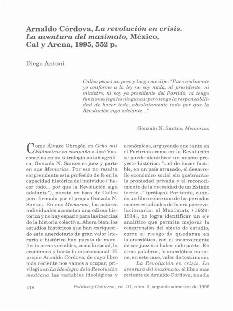 kilómetros en campaña o José Vas- el Porfiriato como en la Revolución concelos en su tetralogía autobiográfi- se puede identificar un mismo pro- ca, Gonzalo N. Santos es juez y parte yecto histórico: "...el de hacer facti- en sus Memorias. Por eso no resulta ble, en un país atrasado, el deseirro- sorprendente esta profesión de fe en la 11o económico social sin quebrantar capacidad histórica del individuo ("ha- la propiedad privada y el reconoci- cer todo... por que la Revolución siga miento de la necesidad de un Estado adelante"), puesta en boca de Calles fuerte..." (prólogo). Por tanto, cuan- pero firmada por el propio Gonzalo N. do un libro sobre uno de los periodos Santos. En sus Memorias, los actores menos estudiados de la era posrevo- individuales acometen una odisea his- lucionaria, el Maximato (1929- tórica y no hay espacio para las inercias 1934), no logra identificar un eje de la historia colectiva. Ahora bien, los analítico que permita mejorar la estudios históricos que han enriqueci- comprensión del objeto de estudio, do este anecdotario de gran valor Hte- corre el riesgo de quedarse en ríirio e histórico han puesto de mani- lo anecdótico, con el inconveniente fiesto otras variables, como la social, la de ser juez sin haber sido parte. En económica y hasta la internacional. El otras palabras, lo anecdótico no tie- propio Arnaldo Córdova, de cuyo Ubro ne, en este caso, valor de testimonio. más reciente nos vamos a ocupar, pri- La Revolución en crisis. La vilegió en La ideología de la Revolución aventura del maximato, el libro más mexicana las variables ideológicas y reciente de Arnaldo Córdova, no sólo