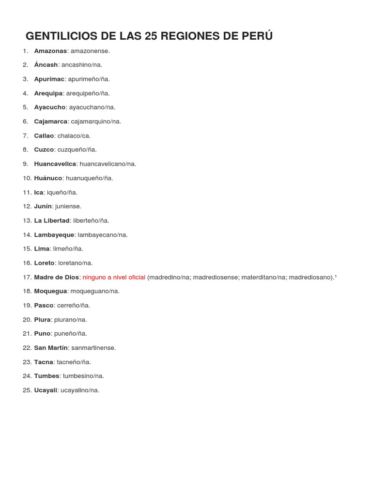 17. Madre de Dios: ninguno a nivel oficial (madredino/na; madrediosense; materditano/na; madrediosano).¹