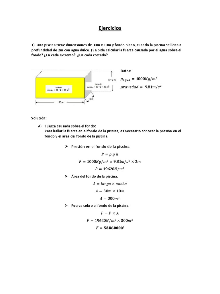 1) Una piscina tiene dimensiones de 30m x 10m y fondo plano, cuando la piscina se llena a