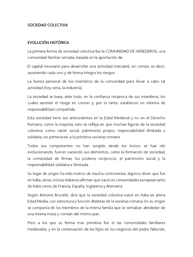 Según Antonio Brunetti, dice que la sociedad colectiva nació en Italia en plena