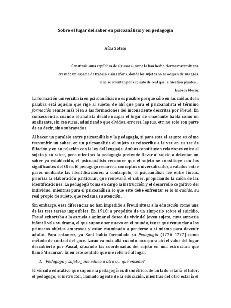 Sobre el lugar del saber en psicoanálisis y en pedagogía