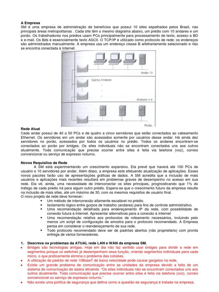 1. Descreva os problemas da ATUAL rede LAN e WAN da empresa SM.