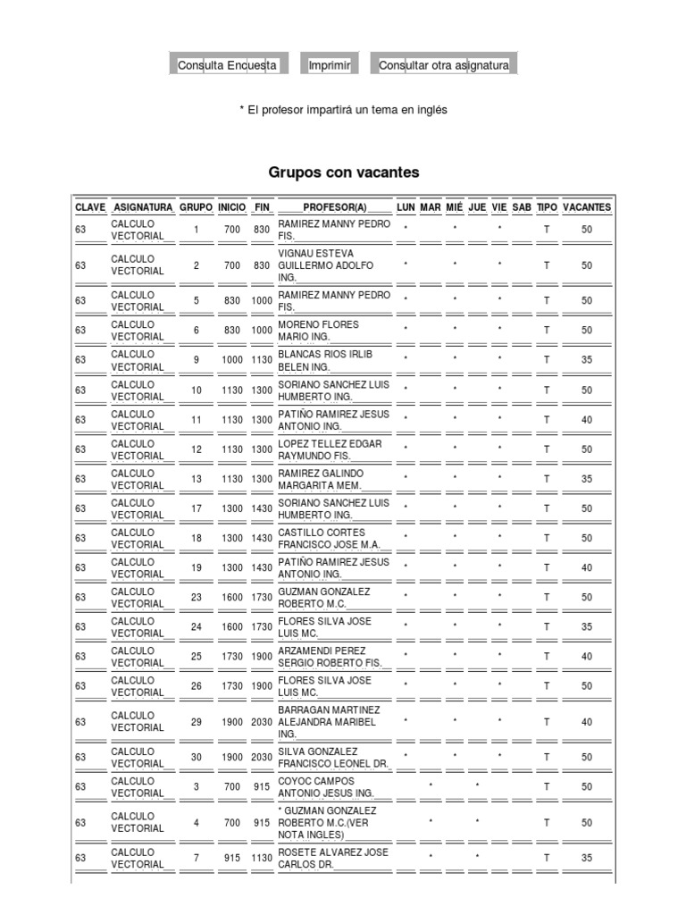 CLAVE ASIGNATURA GRUPO INICIO FIN PROFESOR(A) LUN MAR MIÉ JUE VIE SAB TIPO VACANTES