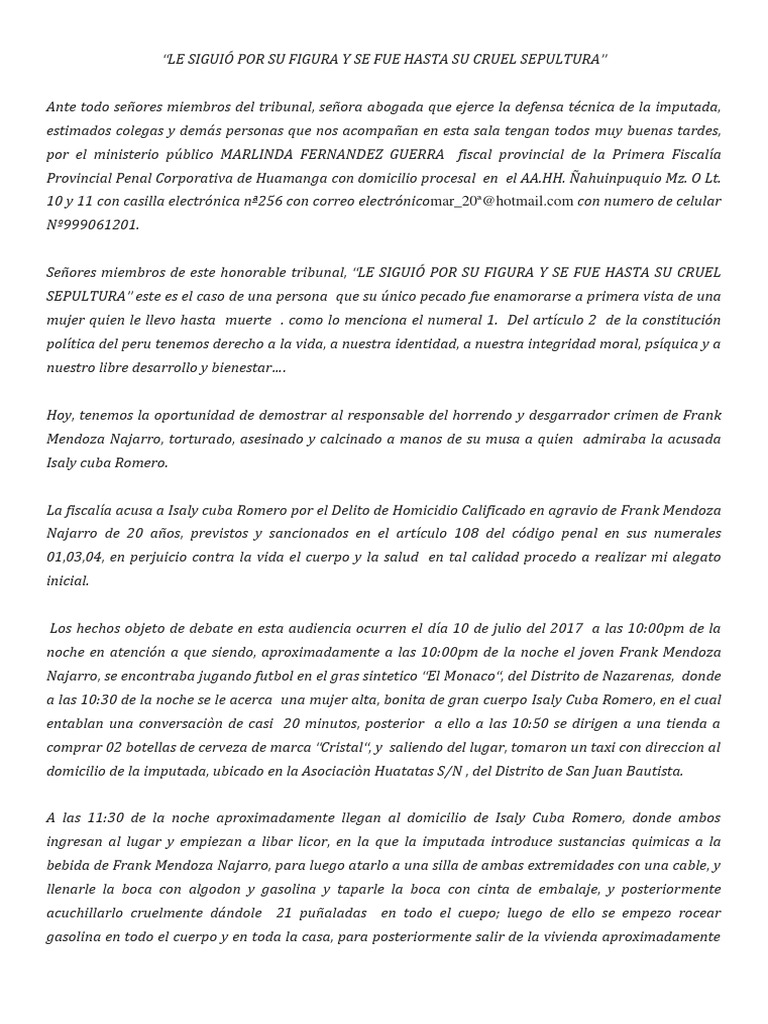 La fiscalía acusa a Isaly cuba Romero por el Delito de Homicidio Calificado en agravio de Frank Mendoza