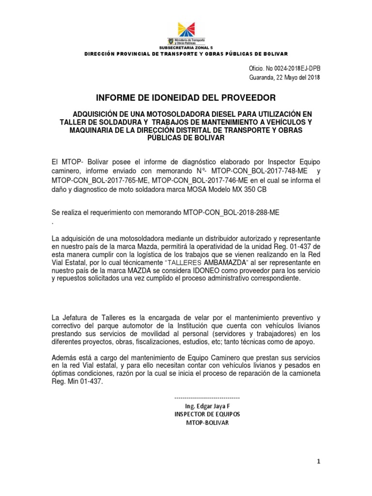 caminero, informe enviado con memorando N°- MTOP-CON_BOL-2017-748-ME y