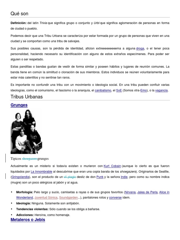 Morfología: Pelo largo y sucio, camisetas a rayas o de sus grupos favoritos (Nirvana, Jalea de Perla, Alice in