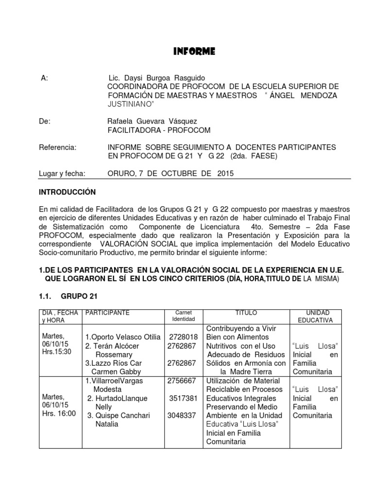 Socio-comunitario Productivo, me permito brindar el siguiente informe: