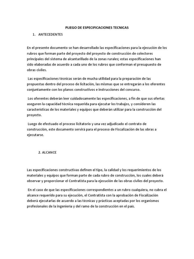 En el presente documento se han desarrollado las especificaciones para la ejecución de los