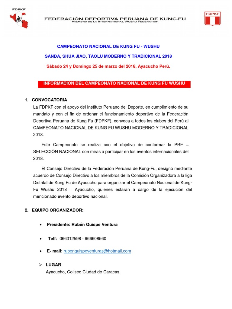 Deportiva Peruana de Kung Fu (FDPKF), convoca a todos los clubes del Perú al