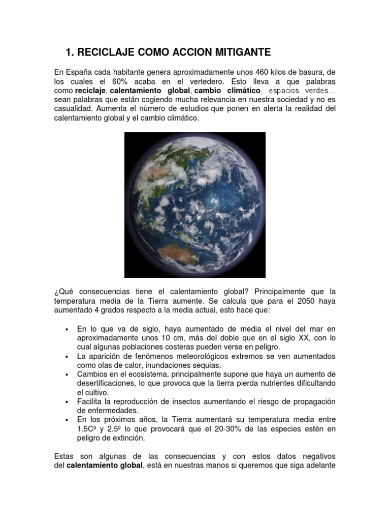 como reciclaje, calentamiento global, cambio climático, espacios verdes…