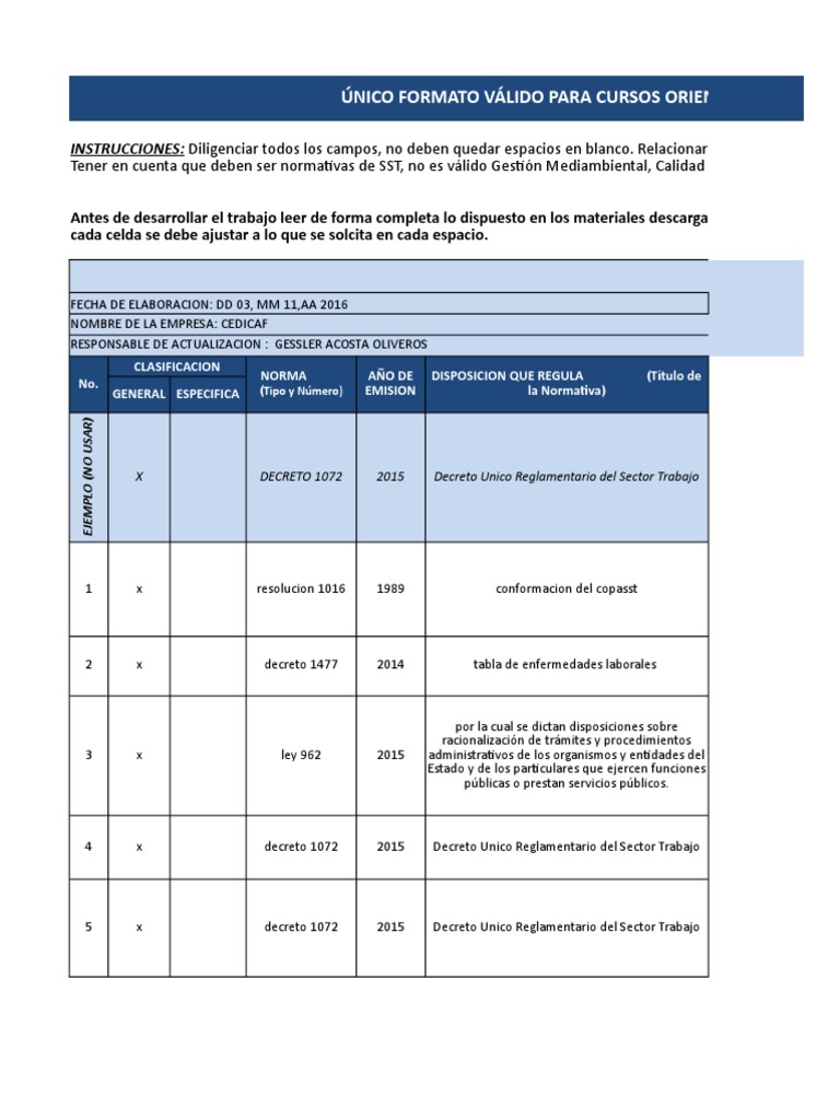 Relacionar al menos cinco (5) normativas de SST en lo posible DIFERENTES, asociadas con la actividad económica de la empres