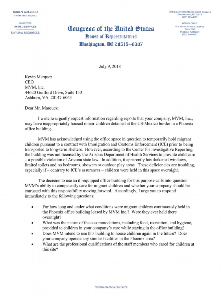 Rep. Ruben Gallego wrote to MVM, Inc. CEO Kevin Marquez regarding reports that the company may have inappropriately housed children detained at the U.S.-Mexico border in a Phoenix office bui…Descripción completa