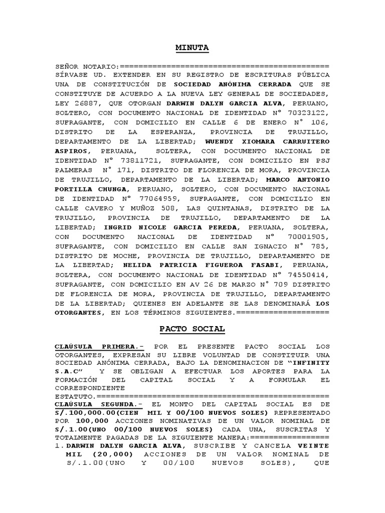 PRIMERO.- BAJO DENOMINACION DE: “INFINITY S.A.C” SE