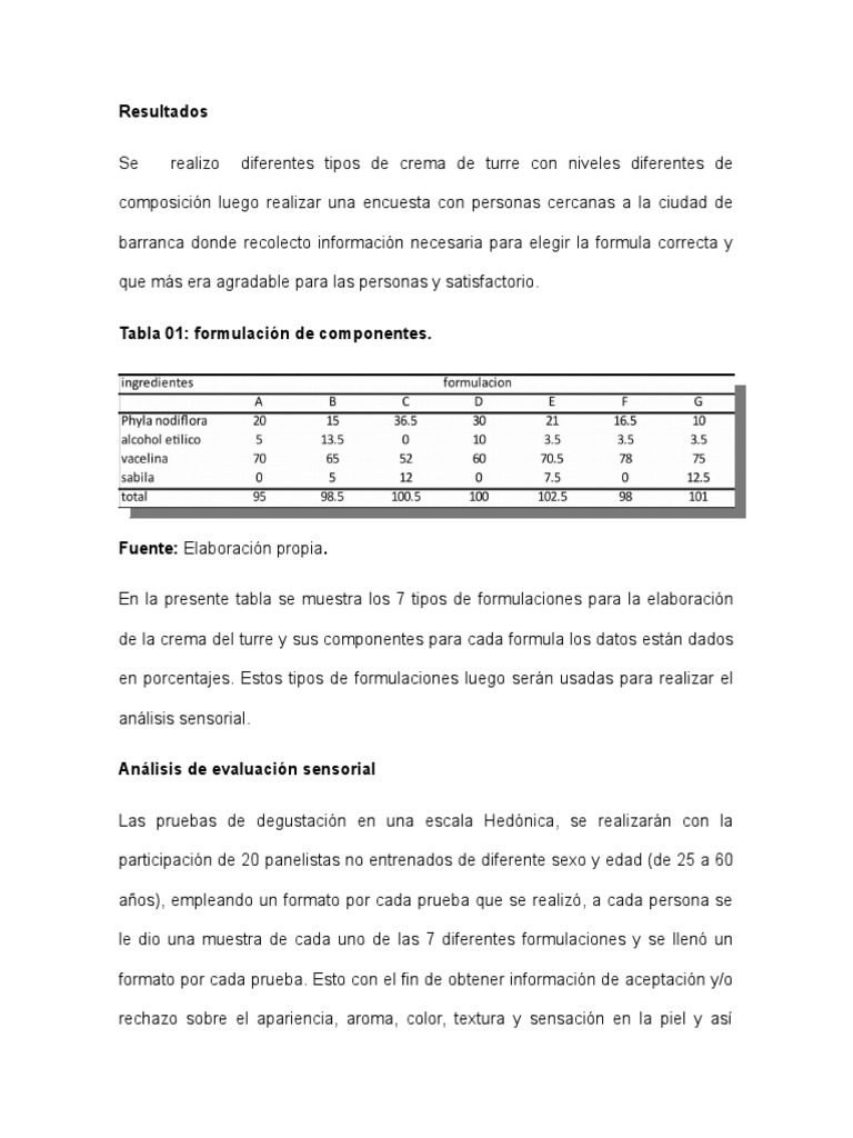 Por lo tanto.mucho por encima del resto de tratamientos que no fue de gusto total en las personas evaluadas. Discusión El objetivo propuesto en el presente trabajo era la elaboración de la crema a base de turre y está a sido alcanzado se probaron con diferentes combinaciones de la crema entre sus ingredientes principales luego esta fue probada por personas y de allí obtuvimos una crema con 30% de turre. la duración de nuestra pomada aun esta en observación pero se calcula que sería de 45 días y su efectividad también falta comprobar puesto que este trabajo se realizó en un tiempo corto y aún deben realizarse pruebas . alcohol 10% y sabila0%. ni análisis sobre estas pruebas. Cabe mencionar que los resultados obtenidos solo son de aceptación de público mas no se realizaron pruebas de laboratorios. . ya que los tratamientos para esta enfermedad son largos y duran de 1 a 2 años. “Santa Teresita de Jesús” creadores del “TURREBIODERM: Pomada a base de hojas de turre hembra para la cura natural del vitíligo y otras afecciones de la piel” cuya pomada tiene una duración de dos meses. concluimos que nuestro trabajo está en proceso de pruebas ya que el tiempo que se tuvo fue muy corto para poder apreciar la efectividad de la crema. no lleva nada de químicos por eso dura tan poco. pero tenemos confianza que será un éxito y de gran ayuda a las personas que sufren con esta enfermedad. A diferencia de los alumnos de la I. por ello cada mes y medio deben elaborar nuevas pomadas. 1.E. 60% de vaselina. dura poco tiempo ya que es 100% natural.P.1.
