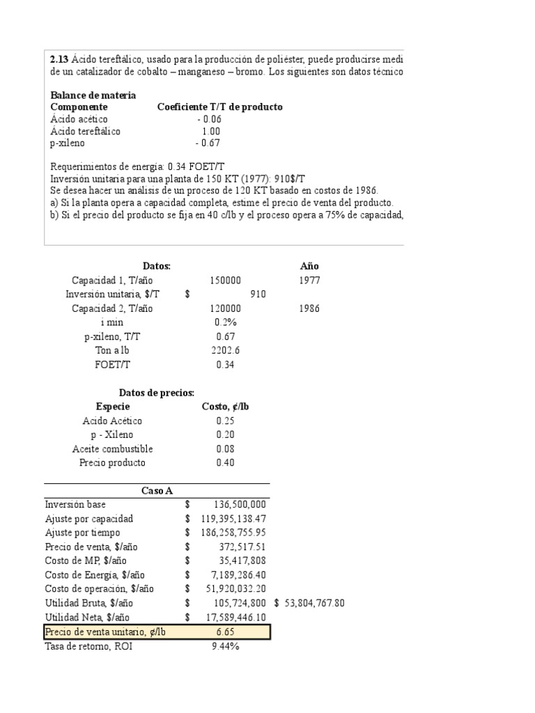 b) Si el precio del producto se fija en 40 c/lb y el proceso opera a 75% de capacidad, estime la tasa de retorno.