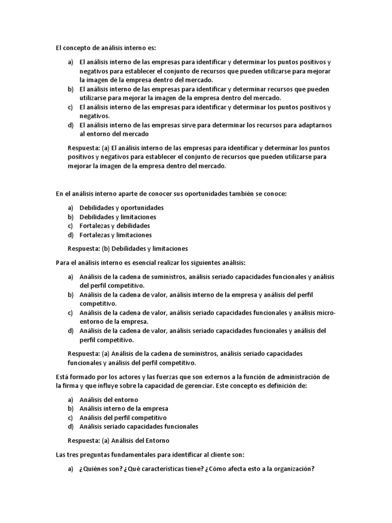 Respuesta: (a) El análisis interno de las empresas para identificar y determinar los puntos