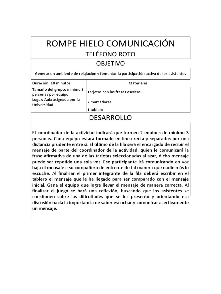 inicial. Gana el equipo que logre llevar el mensaje de manera correcta. Al
