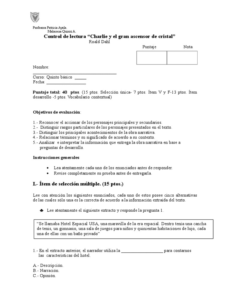 Control de lectura “Charlie y el gran ascensor de cristal”