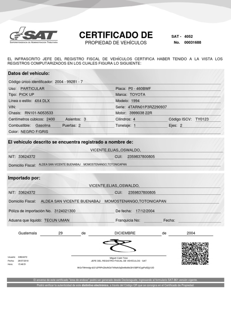 Fecha: 26/07/2018 JEFE DEL REGISTRO FISCAL DE VEHÍCULOS - SAT