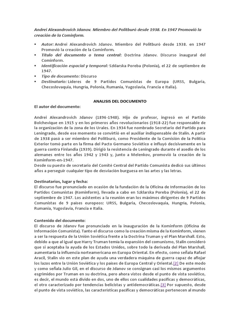 Título del documento o tema central: Doctrina Jdanov. Discurso inaugural del