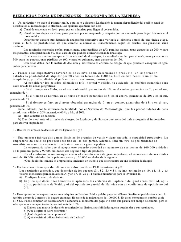 EJERCICIOS TOMA DE DECISIONES – ECONOMÍA DE LA EMPRESA