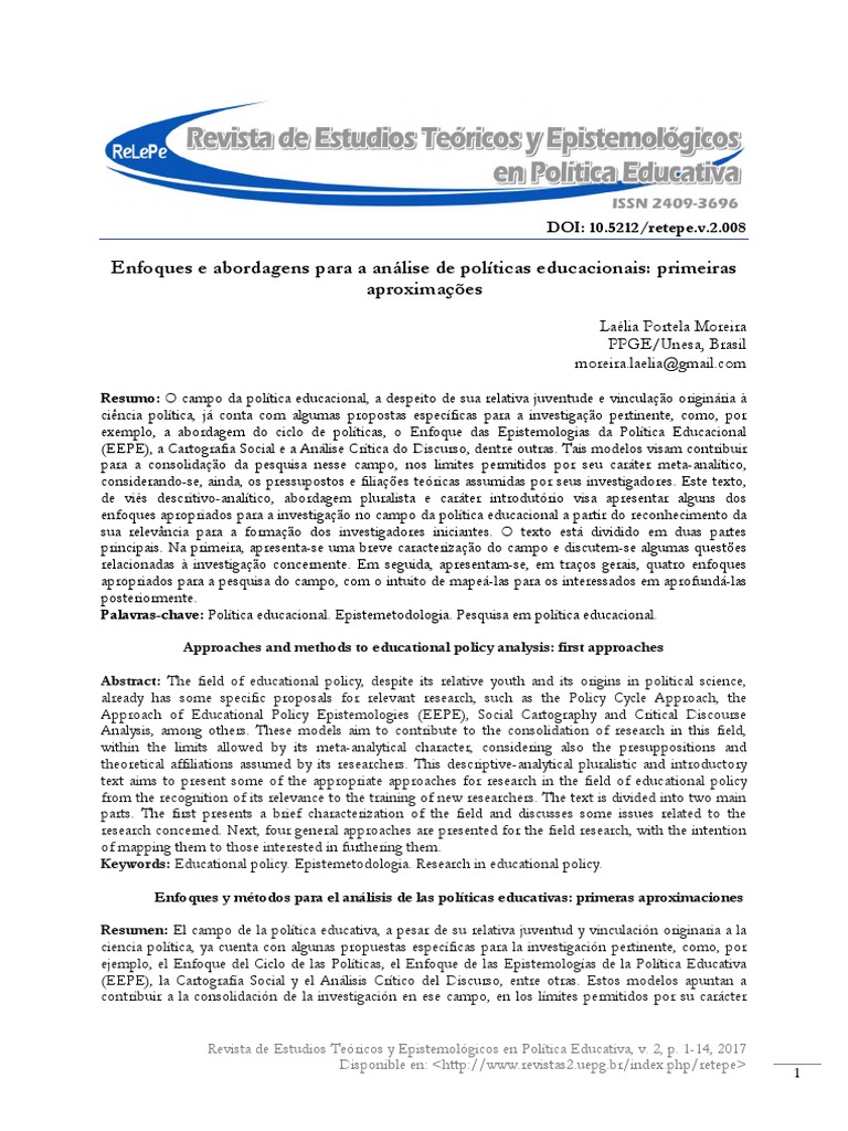 exemplo, a abordagem do ciclo de políticas, o Enfoque das Epistemologias da Política Educacional