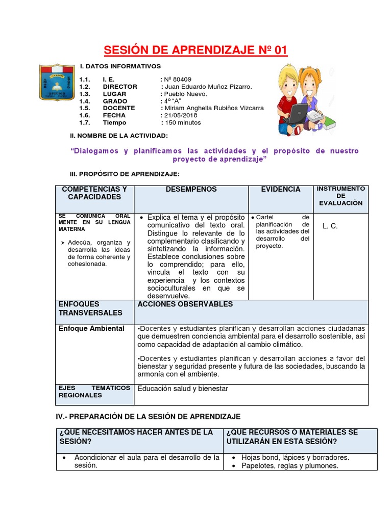 1.4. NOMBRE DE LA ACTIVIDAD: “Dialogamos y planificamos las actividades y el propósito de nuestro proyecto de aprendizaje”