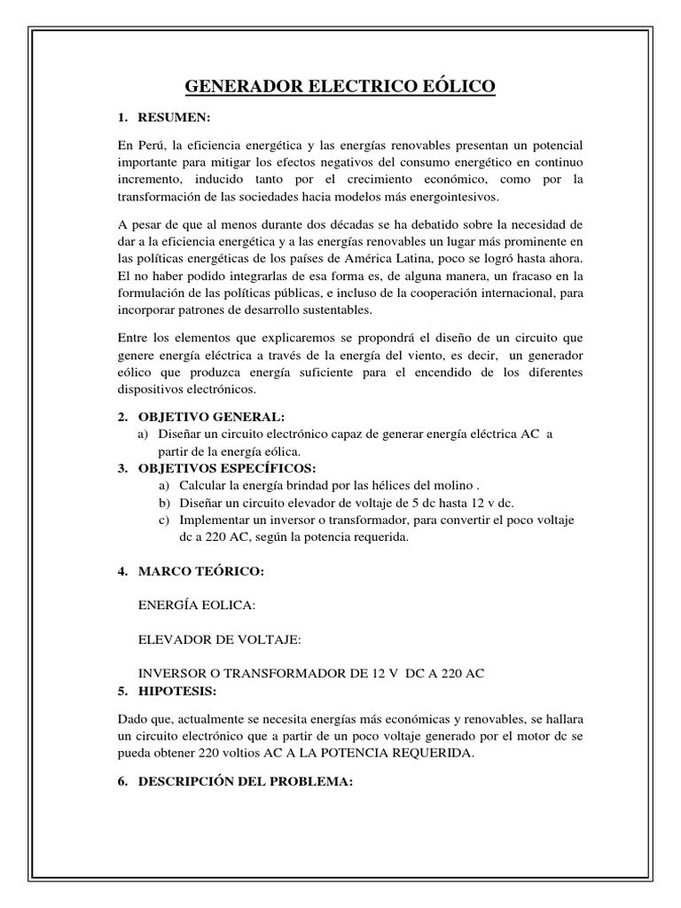 Por lo expuesto se plantea realizar un generador eólico, que partir de la generación
