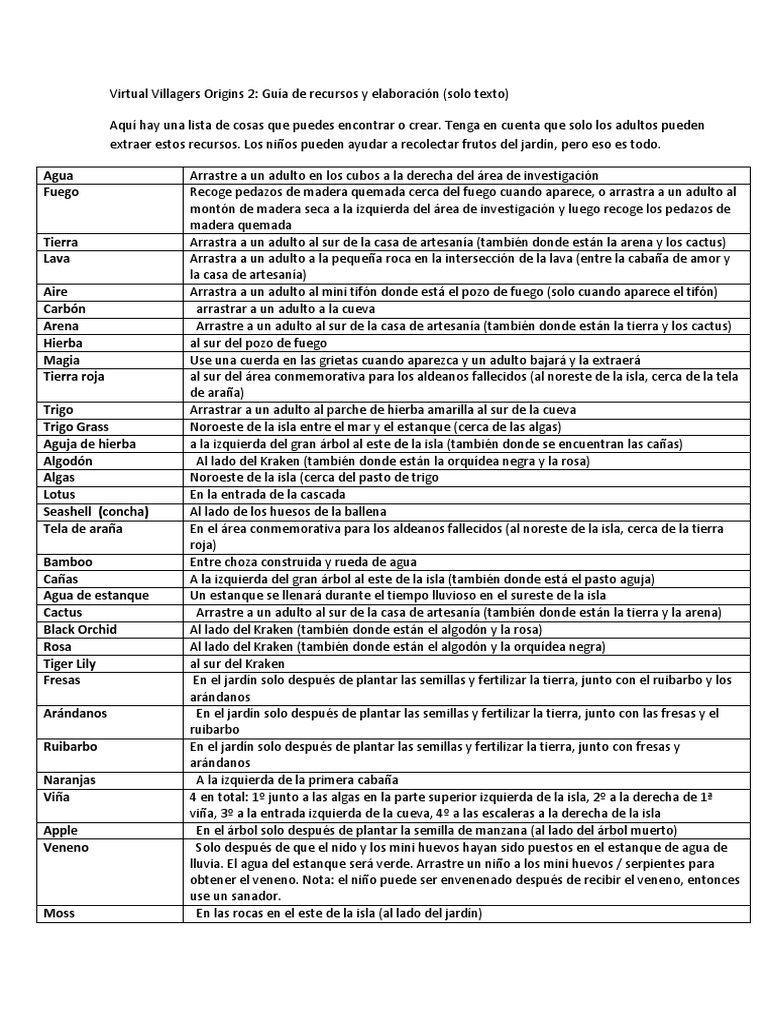 Virtual Villagers Origins 2: Guía de recursos y elaboración (solo texto)
