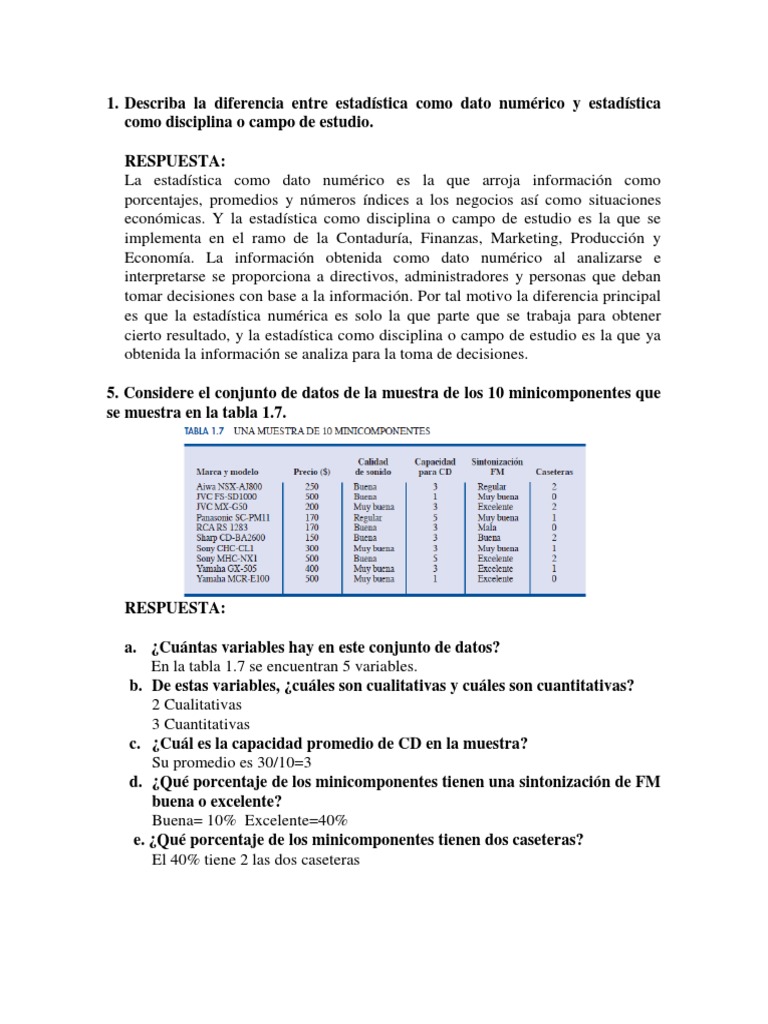 5. Considere el conjunto de datos de la muestra de los 10 minicomponentes que