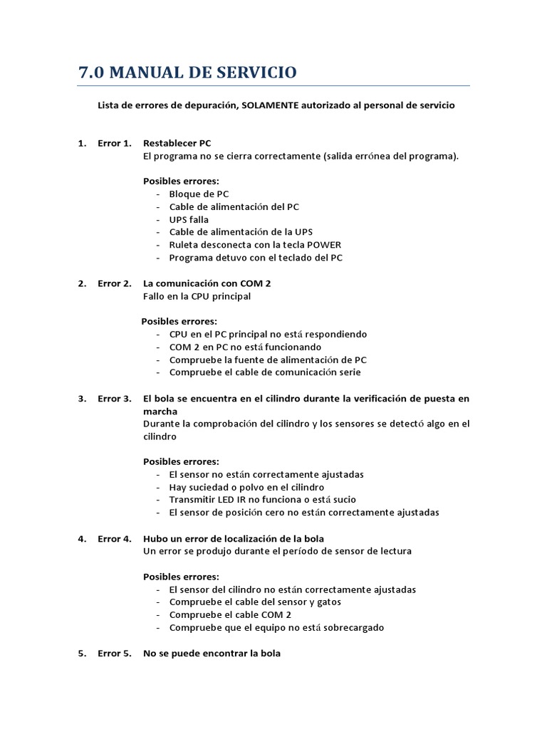 Lista de errores de depuración, SOLAMENTE autorizado al personal de servicio
