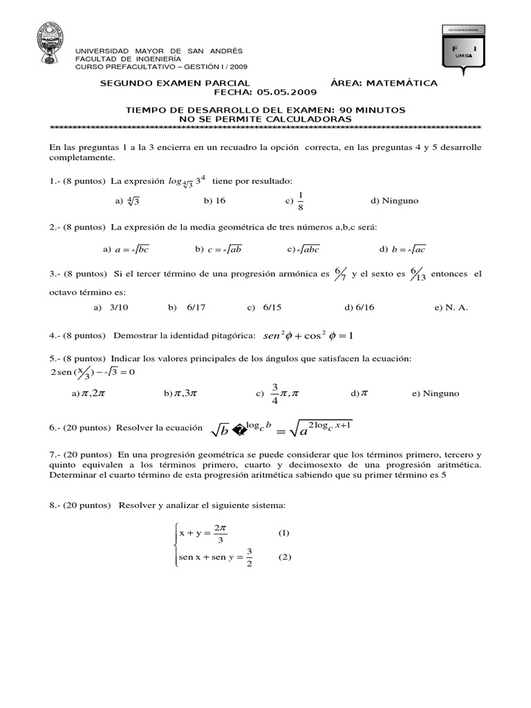 SEGUNDO EXAMEN PARCIAL ÁREA: MATEMÁTICA