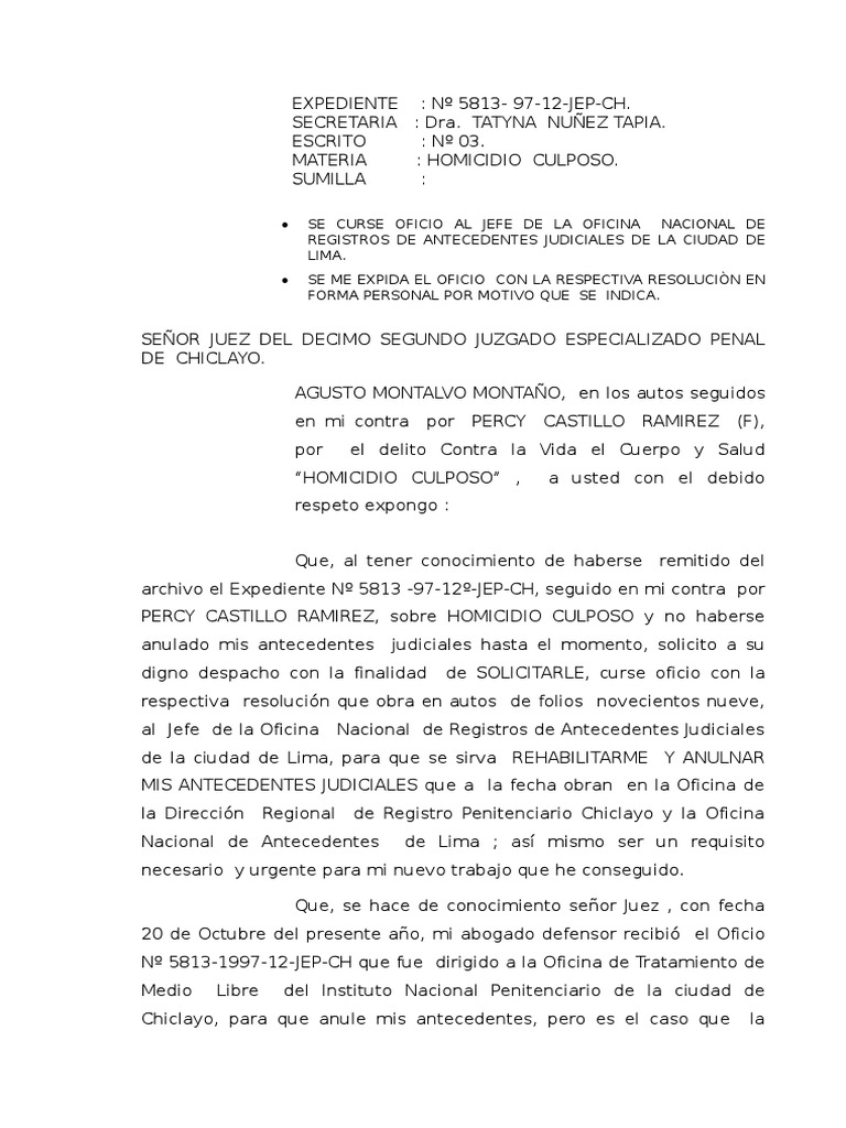 Chiclayo, para que anule mis antecedentes, pero es el caso que la
