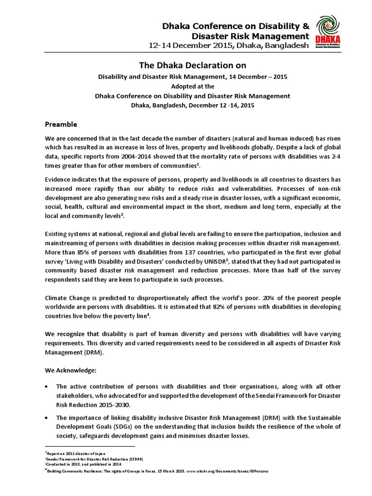We, the participants of the Dhaka Conference on Disability and Disaster Risk Management, representing