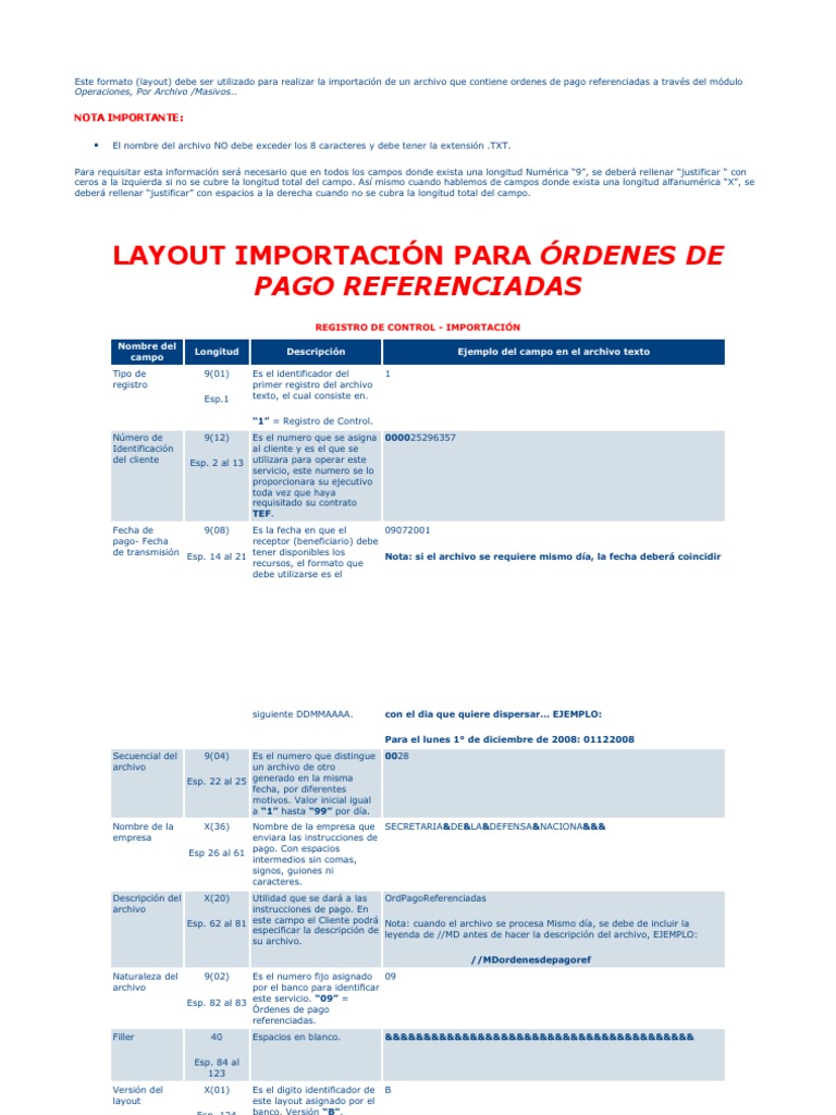 Este formato (layout) debe ser utilizado para realizar la importación de un archivo que contiene ordenes de pago referenciadas