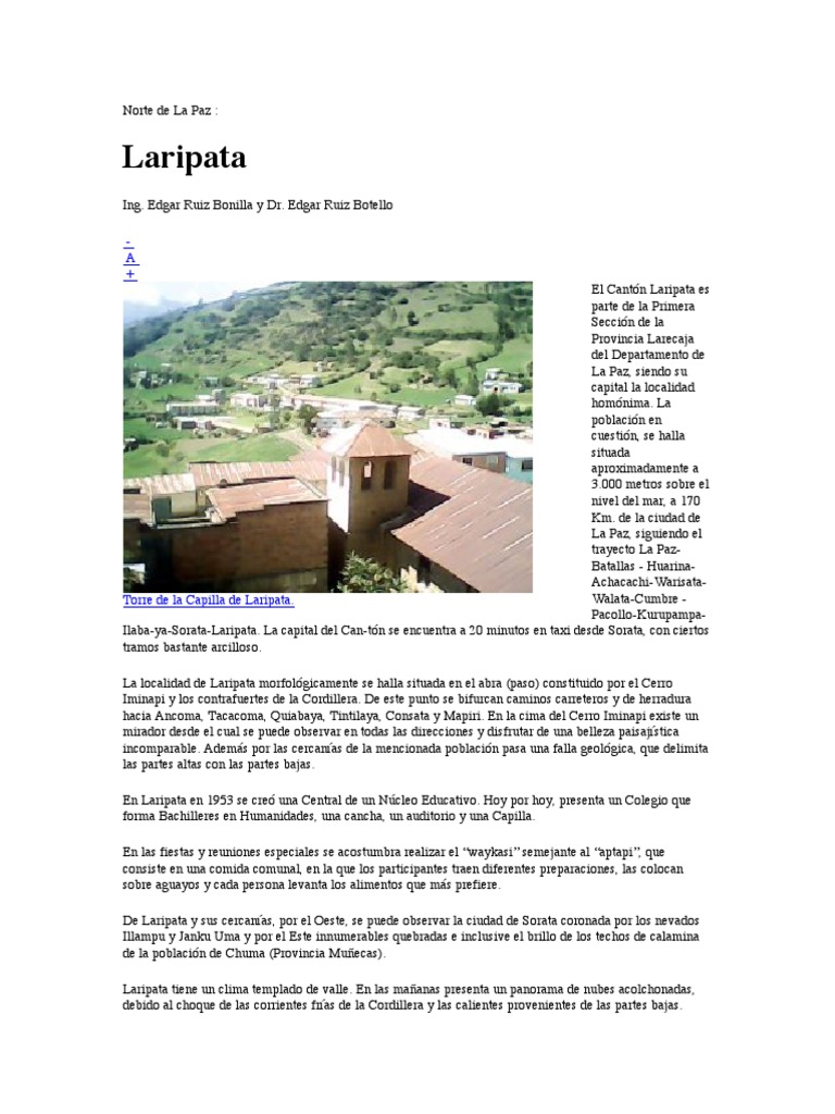 Ilaba-ya-Sorata-Laripata. La capital del Can-tón se encuentra a 20 minutos en taxi desde Sorata, con ciertos
