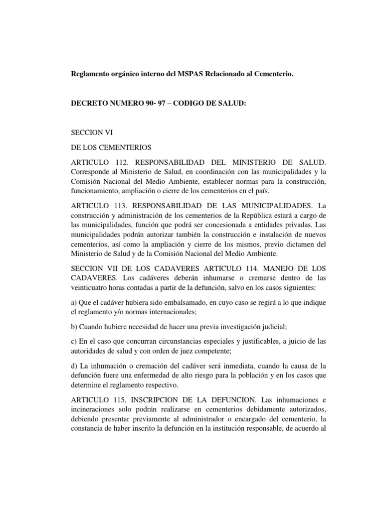 Reglamento orgánico interno del MSPAS Relacionado al Cementerio.