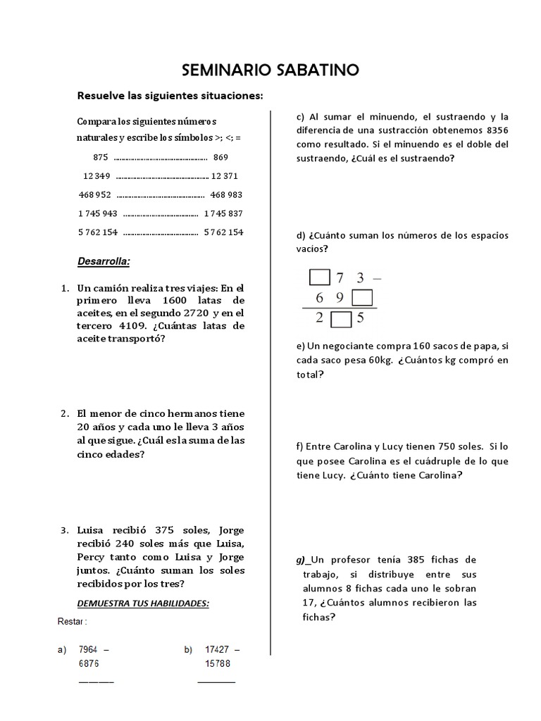 Compara los siguientes números c) Al sumar el minuendo, el sustraendo y la