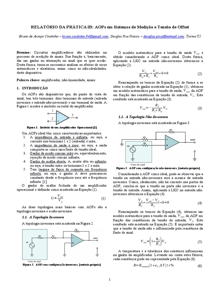 Resumo: Circuitos amplificadores são utilizados no processo de medição de sinais. Sua função é, basicamente, dar um ganho ou atenuação no sinal que se quer medir. Desta forma, torna-se necessário analisar os efeitos de erros sistemáticos e aleatórios, assim como as não-idealidades, deste dispositivo.