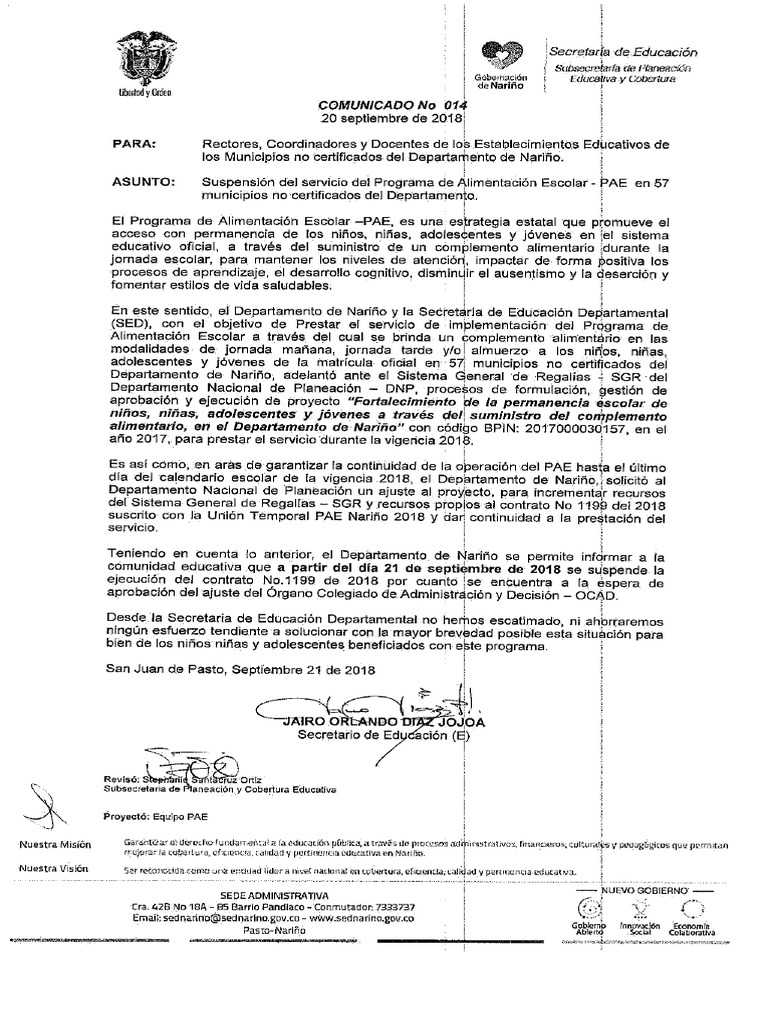 dia del calendario escolar de la vigencia 2018, e! Departamento de Narifo,,solicité al