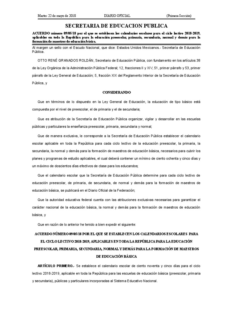 ACUERDO NÚMERO 09/05/18 POR EL QUE SE ESTABLECEN LOS CALENDARIOS ESCOLARES PARA