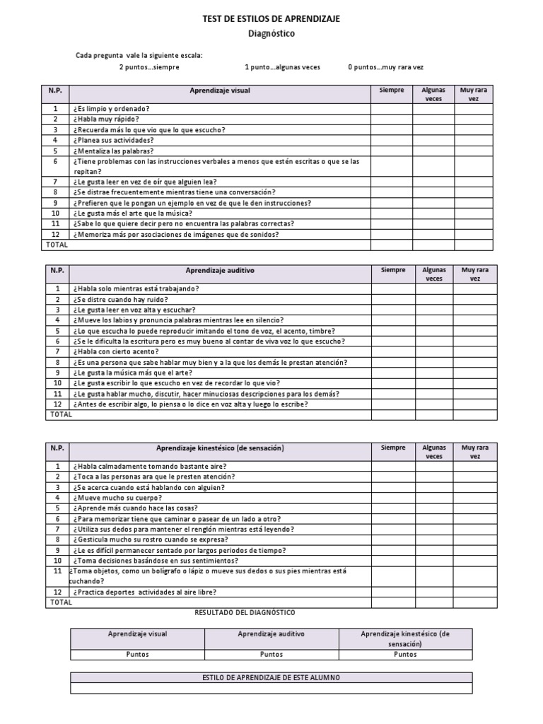 N.P. Aprendizaje kinestésico (de sensación) Siempre Algunas Muy rara