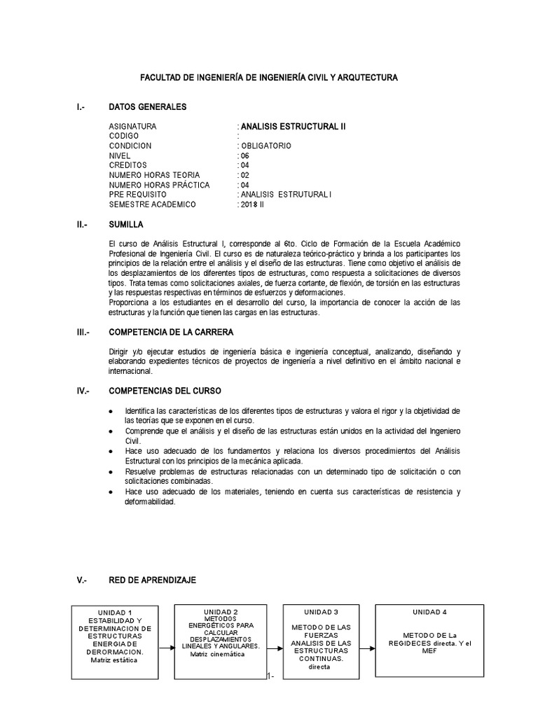 El curso de Análisis Estructural I, corresponde al 6to. Ciclo de Formación de la Escuela Académico