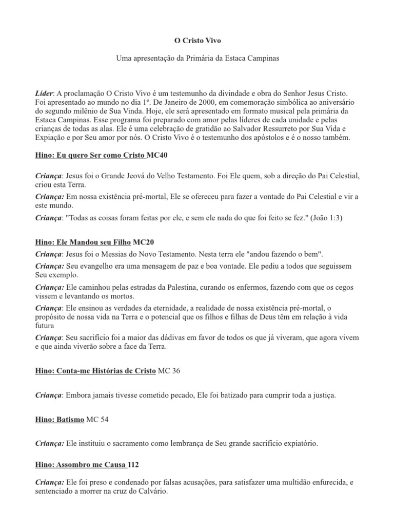 Líder: A proclamação O Cristo Vivo é um testemunho da divindade e obra do Senhor Jesus Cristo.