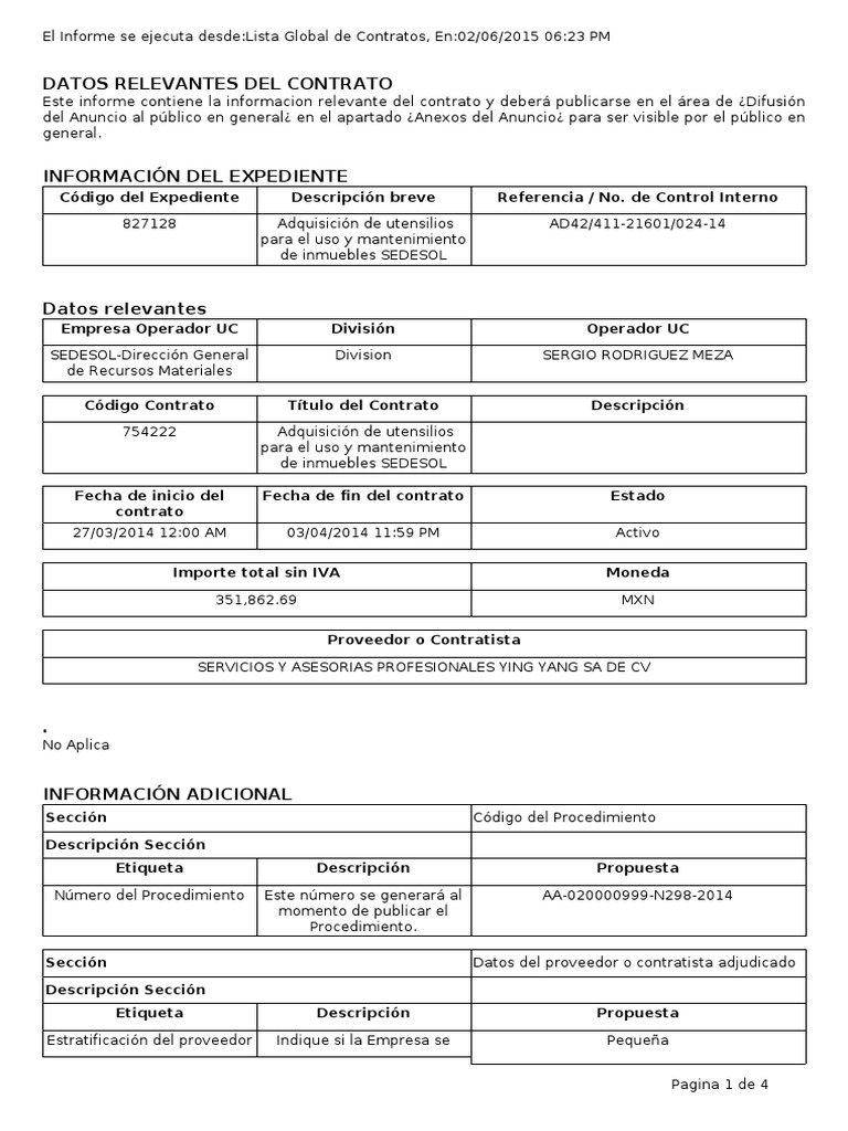 Este informe contiene la informacion relevante del contrato y deberá publicarse en el área de ¿Difusión