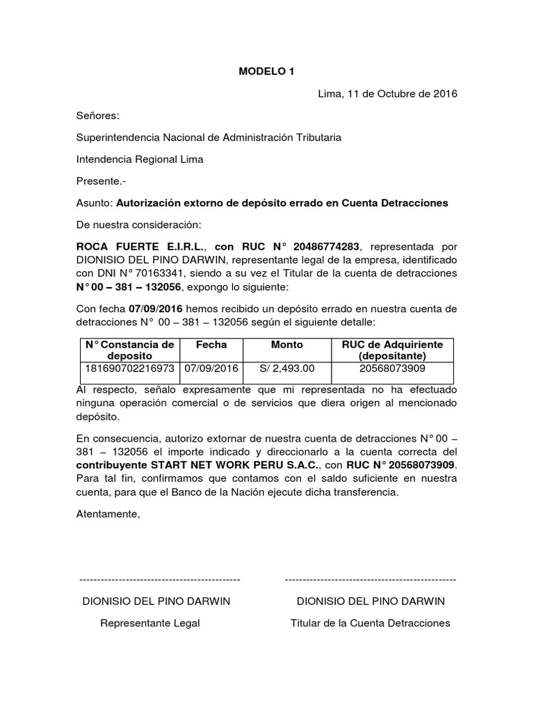 En consecuencia, autorizo extornar de nuestra cuenta de detracciones N° 00 –