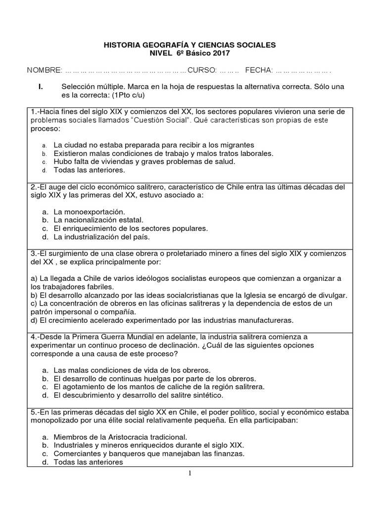 I. Selección múltiple. Marca en la hoja de respuestas la alternativa correcta. Sólo una