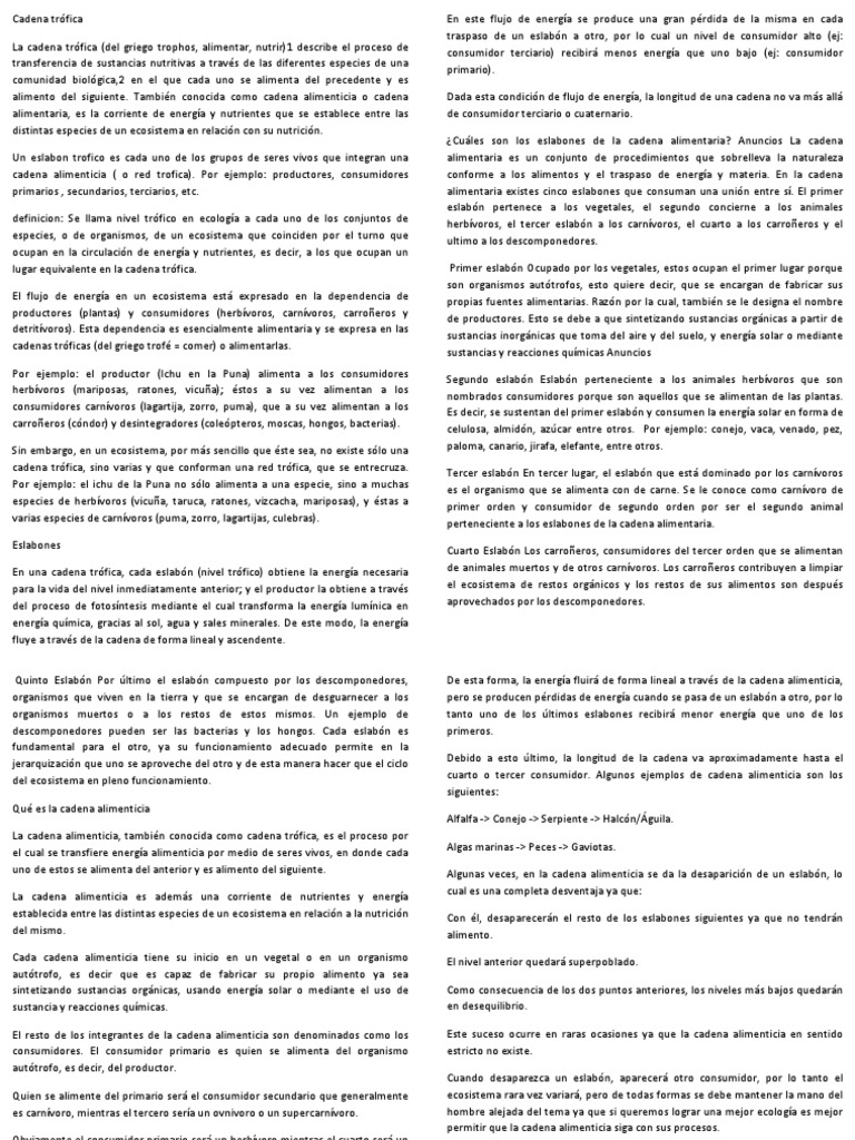La cadena trófica (del griego trophos, alimentar, nutrir)1 describe el proceso de consumidor terciario) recibirá menos energía que uno bajo (ej: consumidor